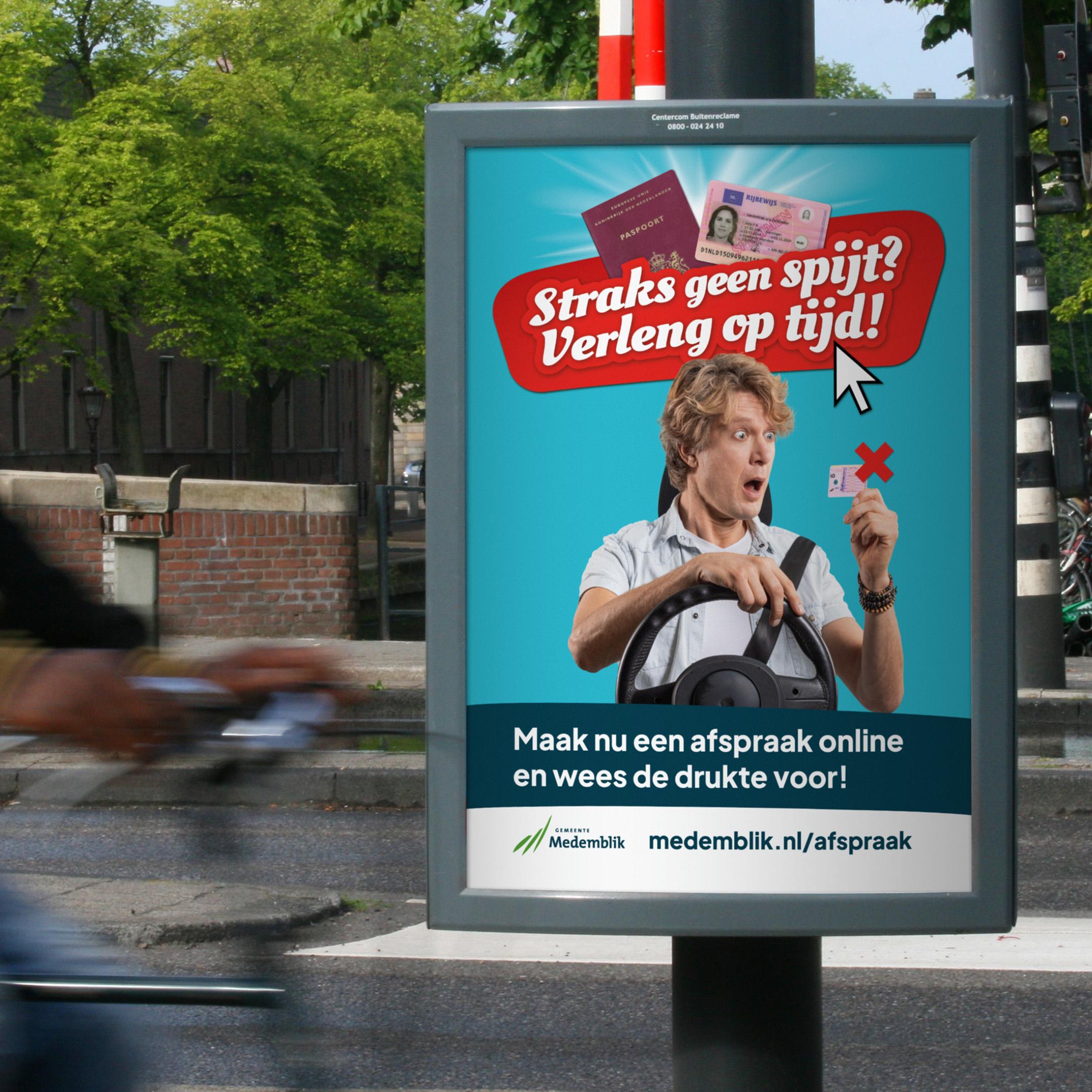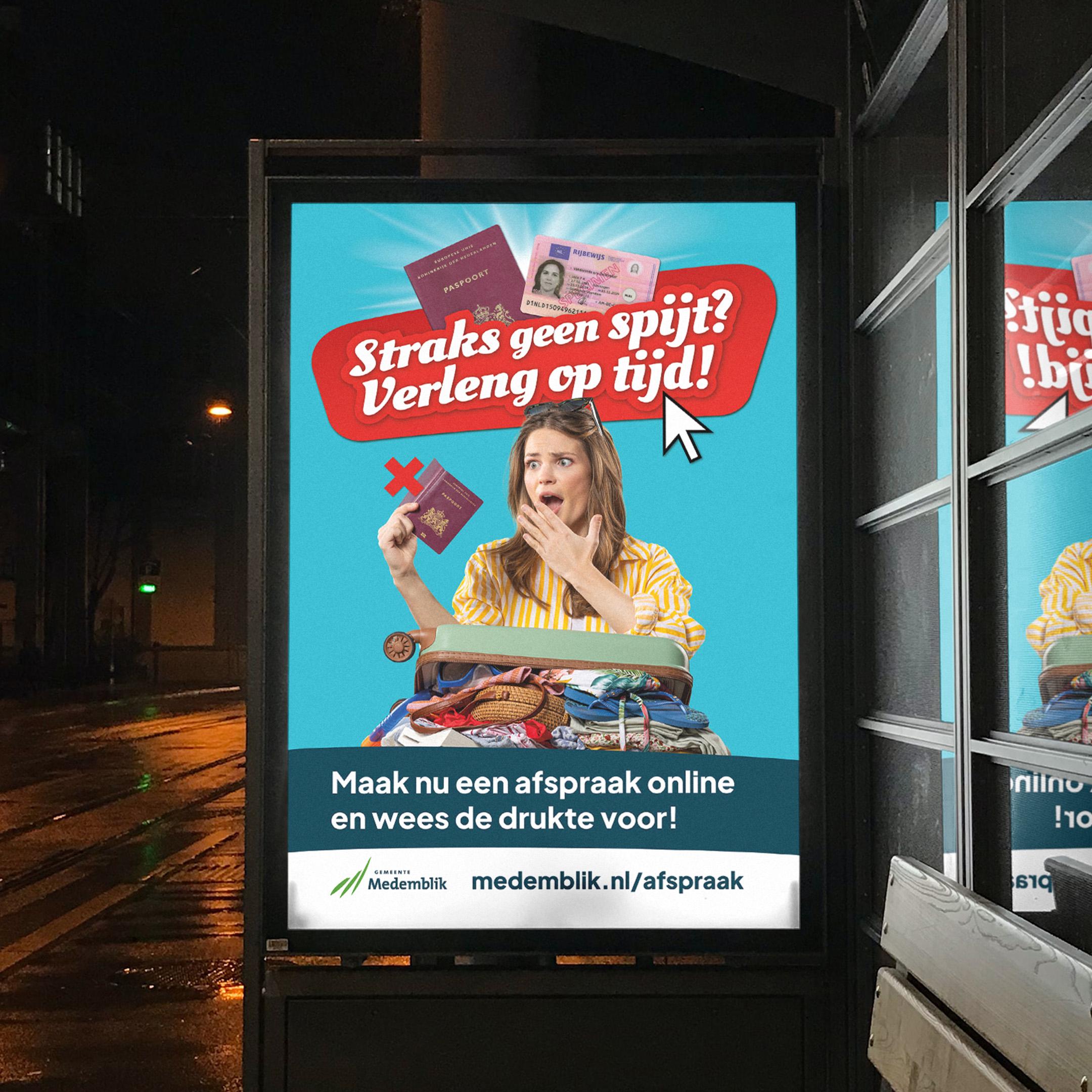 Tien jaar geleden is de geldigheid van een reisdocument gewijzigd, het belooft druk te worden. Daarom wil de gemeente Medemblik vragen om begrip en een goede voorbereiding. De gemeente wil op een nieuwe verfrissende manier inwoners aanspreken. En een gemeente met lef, daar houden wij wel van! Wij hebben een opvallende campagne ontwikkeld die iets weg heeft van een vakantiediscounter met de boodschap ‘Straks geen spijt? Verleng op tijd’. Zo linken we de wens om op vakantie te gaan en het op tijd regelen van je reisdocument.